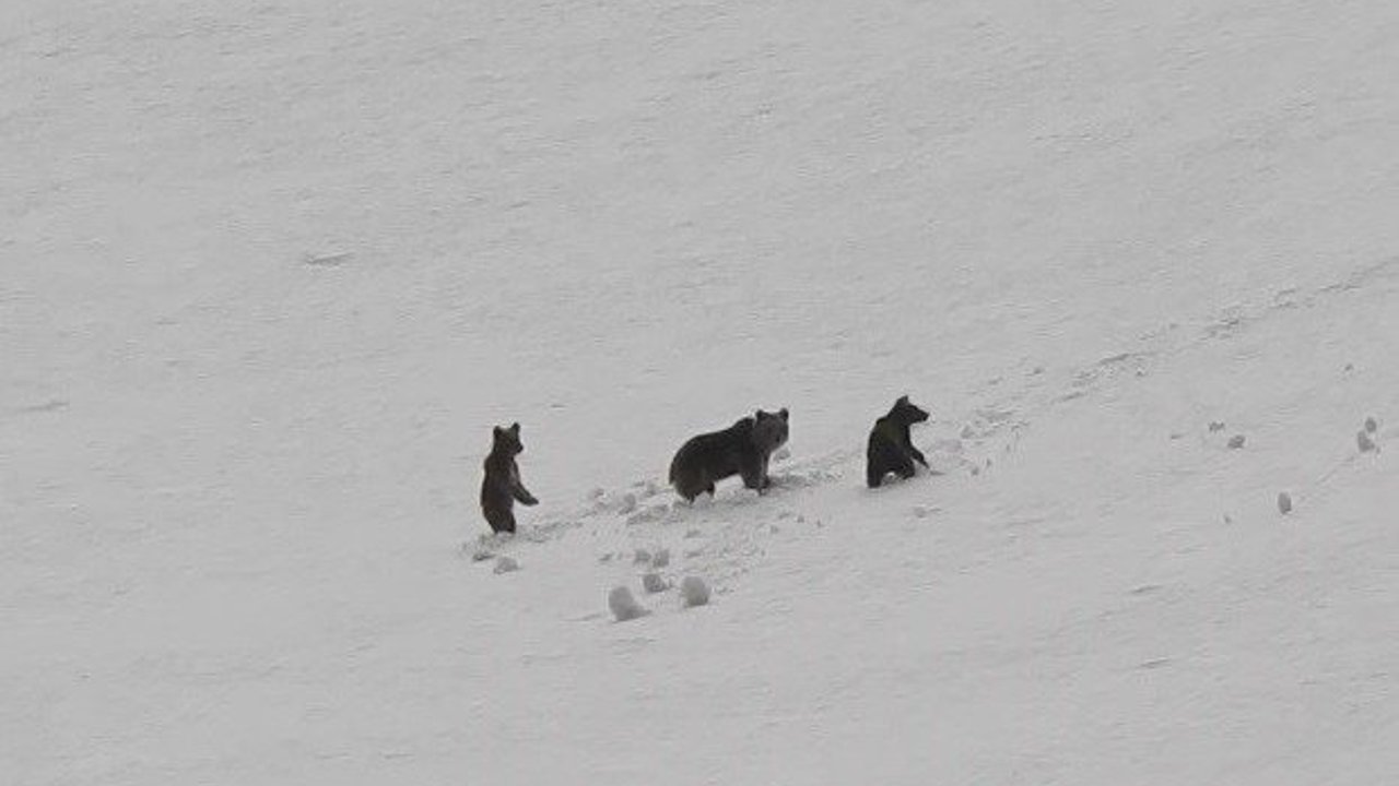 Erzincan'da Munzur Dağları'nda kış uykusundan uyanan anne ayı ve iki yavrusu, karlı arazide yiyecek ararken görüntülendi.