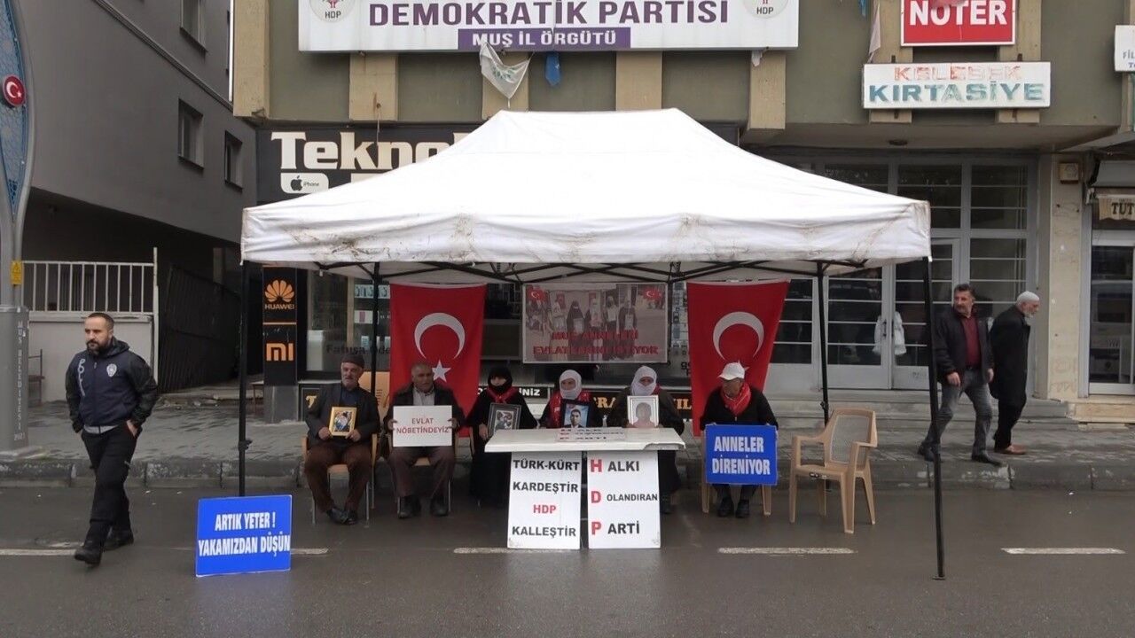 Çocuklarının terör örgütü PKK mensupları tarafından dağa kaçırıldığı iddiasıyla HDP Muş İl Başkanlığı önünde oturma eylemi başlatan aileler, 123 haftadır kararlı bir şekilde devam ettirdikleri evlat nöbetini sürdürüyor. HDP İl Başkanlığı önünde toplanan aileler, "Halk düşmanı parti", "Evlatlarımızı vereceksiniz", "Ha HDP ha PKK", "Türk-Kürt kardeştir, HDP kalleştir", "Halkı dolandıran parti", "Anneler direniyor", "Artık yeter yakamızdan düşün" ve "Yeter artık evlatlarımızı bırakın" yazılı pankartlar açtı. Her çarşamba parti önünde bir araya gelen anne ve babalar, fotoğraflarını taşıdıkları çocuklarına teslim olmaları için çağrıda bulundu.