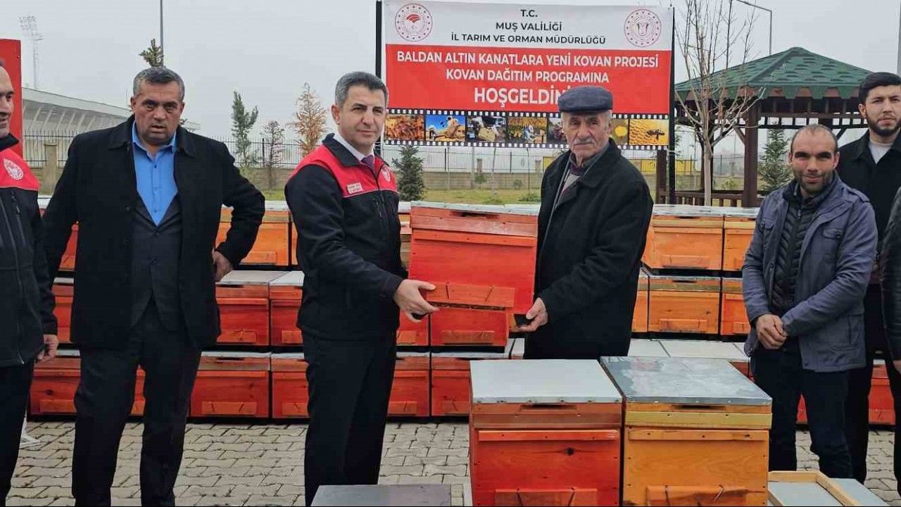 Muş Tarım ve Orman İl Müdürlüğü tarafından hayata geçirilen "Altın Kanatlara Yeni Kovan" projesi kapsamında, arıcılığın geliştirilmesi ve üreticilerin desteklenmesi amacıyla arı kovanı dağıtım programı düzenlendi.