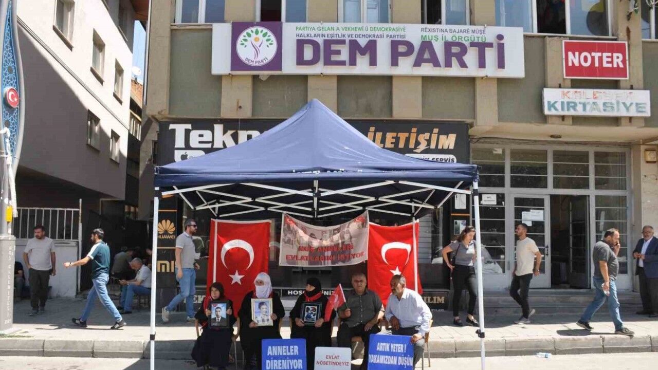 Muş’ta çocukları terör örgütü PKK tarafından kaçırılan aileler, DEM Parti İl Başkanlığı binası önünde eylemlerine devam ediyor.