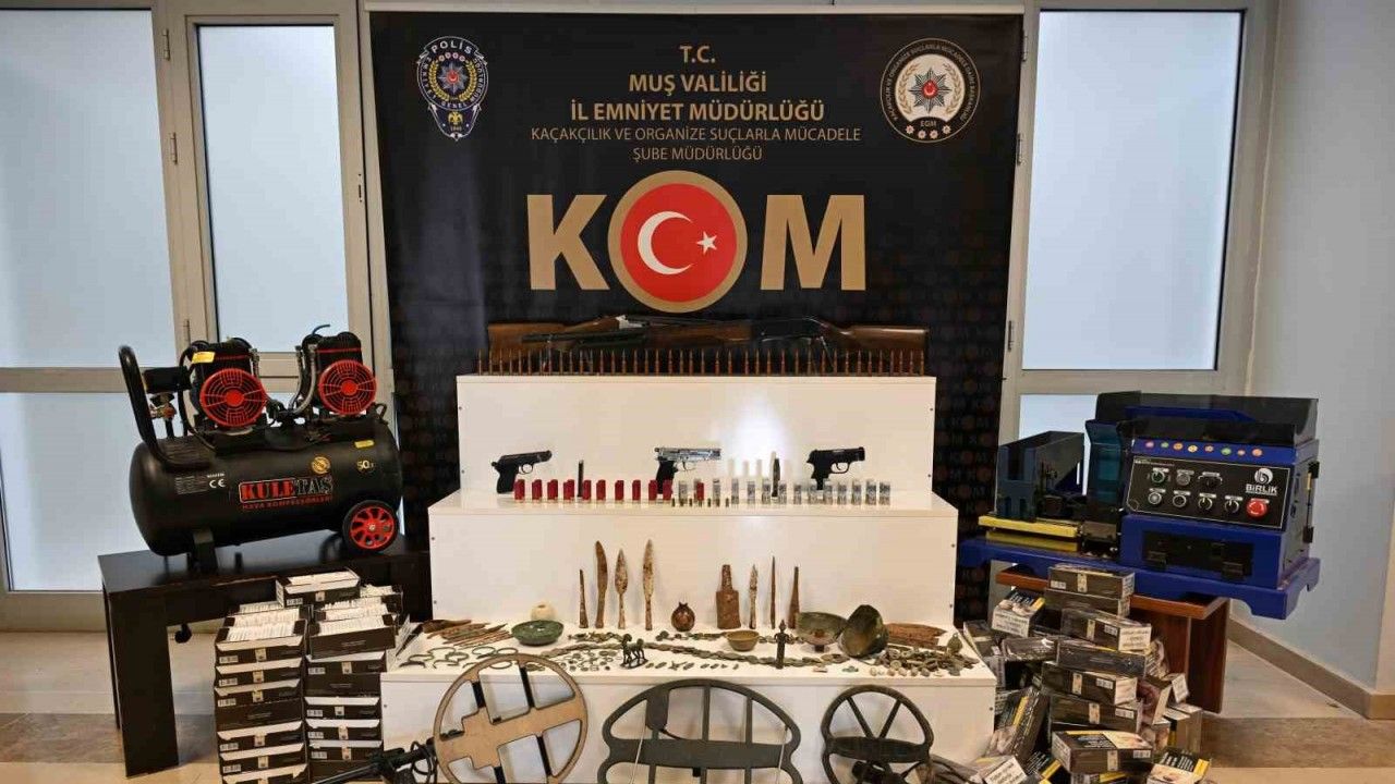 Muş’ta KOM ekiplerince 7 adrese eş zamanlı düzenlenen operasyonda çok sayıda silah, mühimmat ve tarihi eser ele geçirilirken, 7 şüpheli hakkında adli işlem başlatıldı.