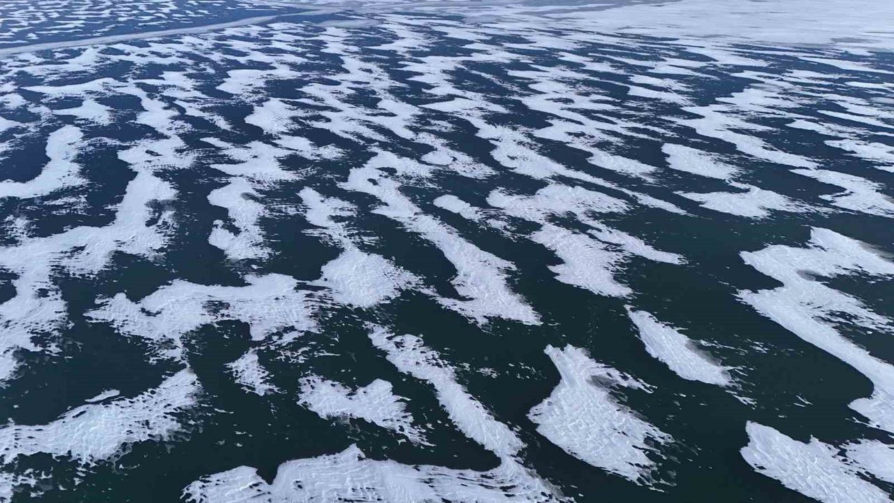 Bitlis'in Ahlat ilçesinde bulunan ve 40 kilometrekarelik alanıyla bölgenin önemli doğal güzellikleri arasında yer alan Nazik Gölü'nün donan yüzeyi görsel şölen sunuyor.