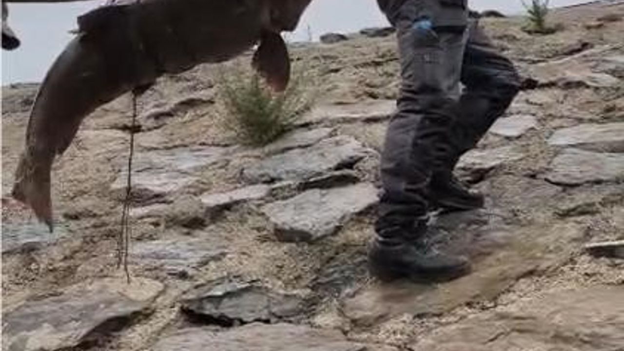 Elazığ’da amatör balıkçılar, Murat Nehri’nde at-çek yöntemiyle 60 kiloluk dev bir turna balığı yakaladı. Yakaladığı dev turnayı kıyıya çıkaran balıkçılar, 60 kiloluk dev turna balığını taşıyamayınca çam sırığına bağladıktan sonra omuzlarda taşıdılar. 2 balıkçı yakalanan dev turna balığını taşımak için zorlanırken, o anlar cep telefonu ile kayıt edildi.