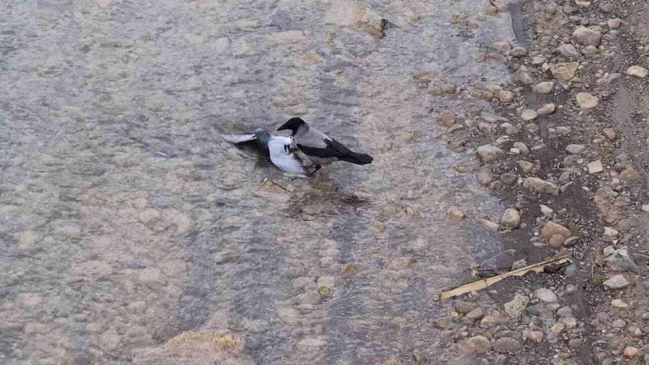 Erzurum’un Oltu ilçesinde Oltu Çayı’na düşen yaralı güvercine kargaların yardım etme çabası yürek burktu. Kargaların çabası güvercini kurtarmaya yetmeyince suya kapılan güvercin su akımına kapılarak öldü.