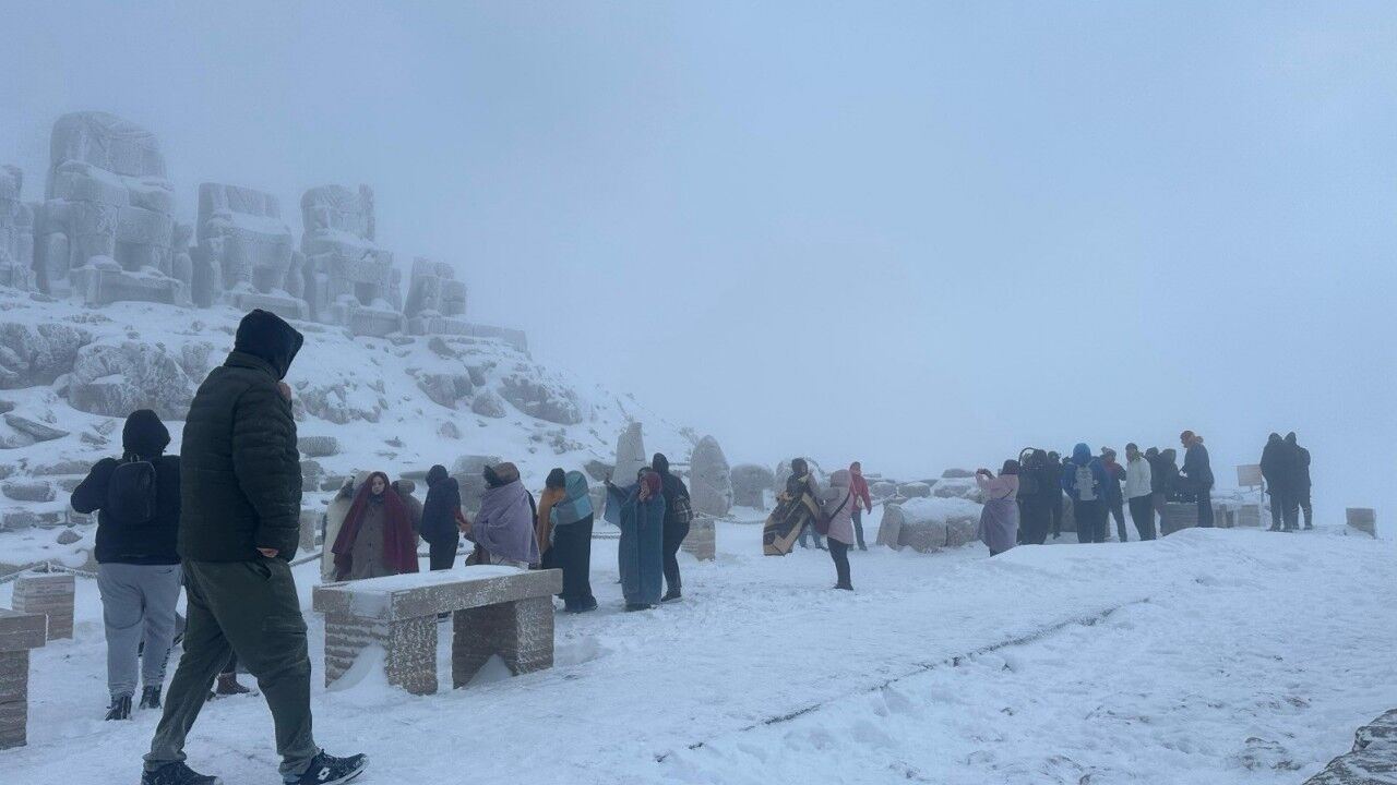 Adıyaman’ın Kahta ilçe sınırlarında bulunan 2 bin 206 metre yükseklikteki Nemrut Dağı, Nisan ayında kar sürpriziyle karşılaştı. Baharı beklerken kar yağışına sahne olan dağda devasa heykeller beyaza büründü. 2 Bin 206 metre yükseklikte yer alan Nemrut Dağı’nı ziyarete gelen yerli ve yabancı turistler kar sürpriziyle karşılaştı.