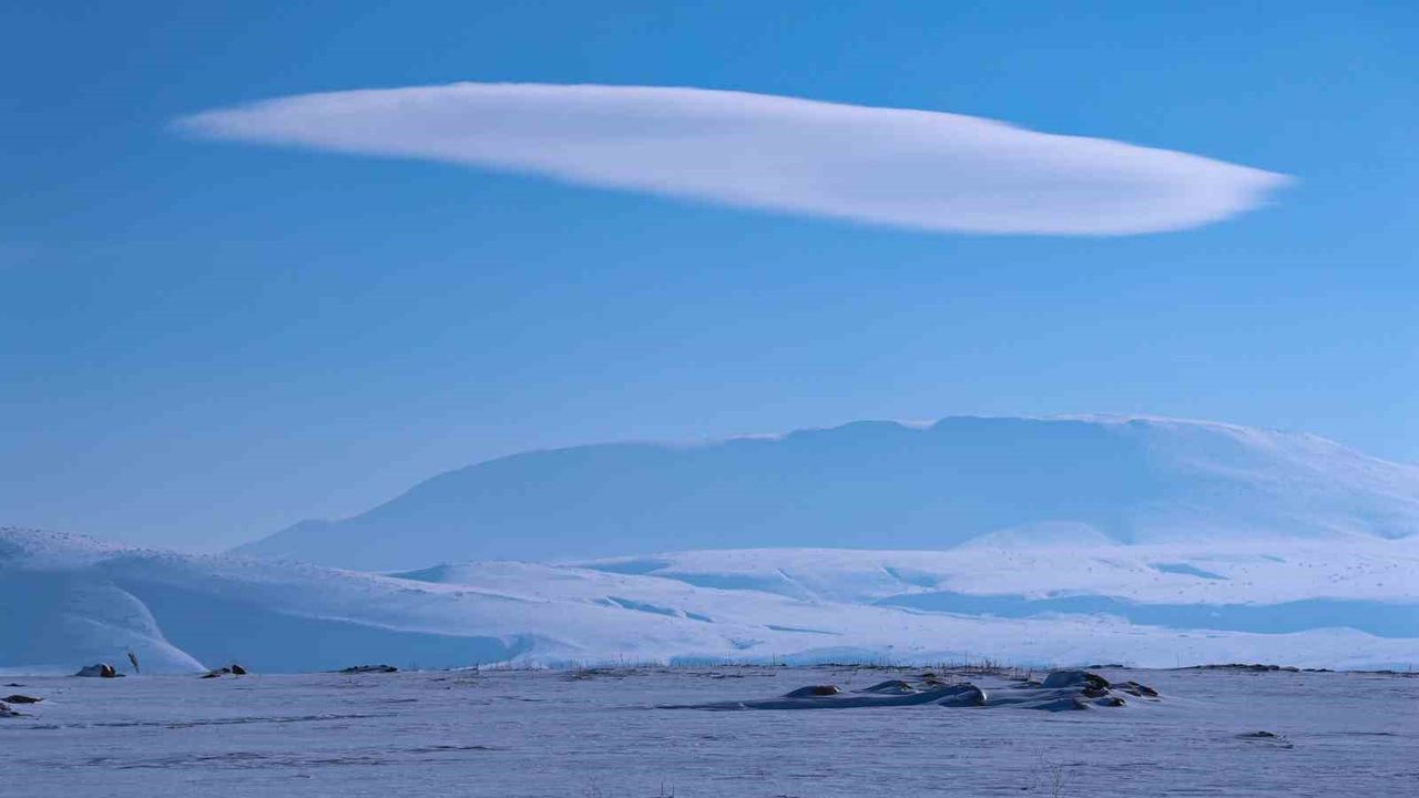 Bitlis'in Ahlat, Güroymak ve Tatvan ilçesi sınırlarında bulunan Nemrut Kalderası üzerinde oluşan mercek bulutu, düzgün ve uzamış yapısıyla gökyüzünde kartpostallık görüntüler oluşturdu.