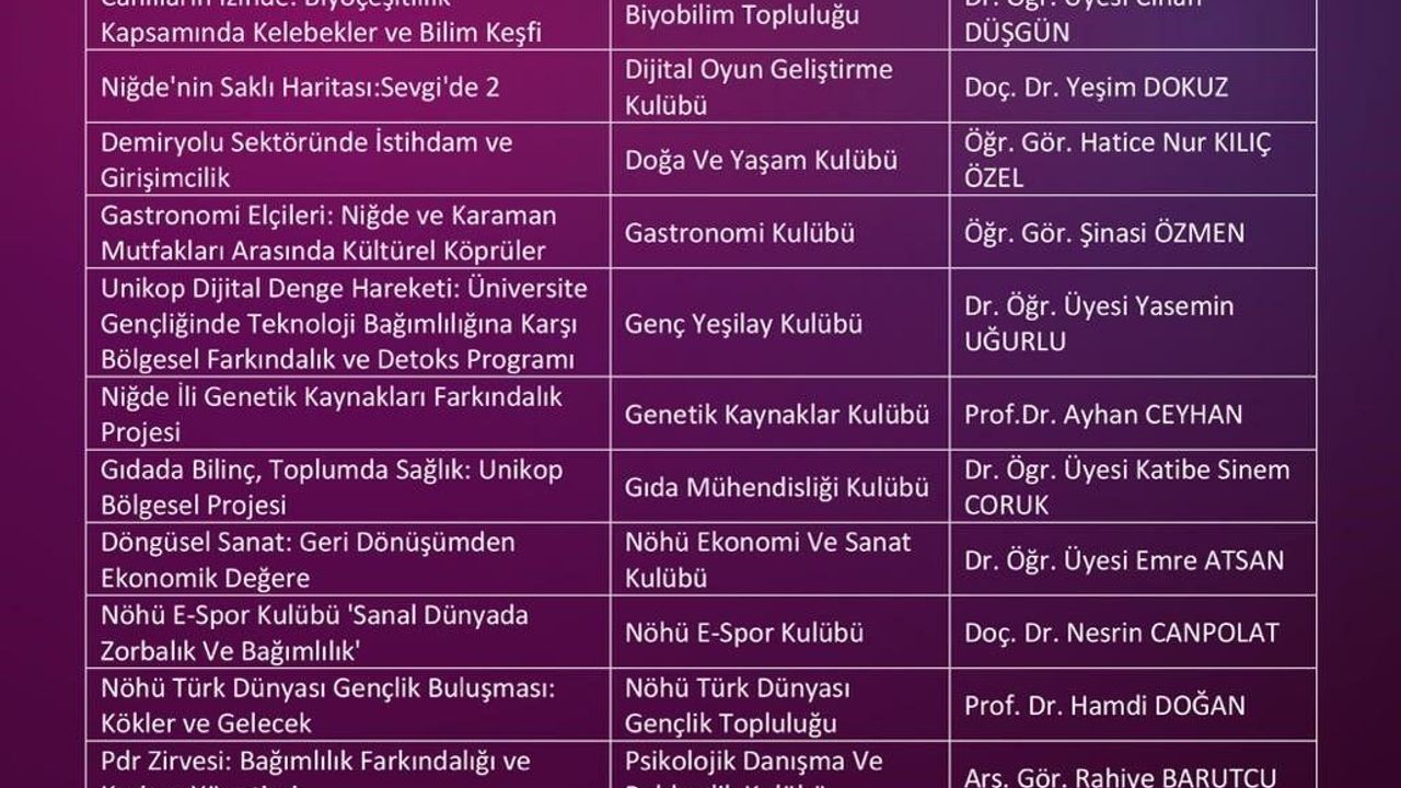 Bu kapsamda Niğde Ömer Halisdemir Üniversitesinin Biyobilim Topluluğu, Dijital Oyun Geliştirme Kulübü, Doğa ve Yaşam Kulübü, Gastronomi Kulübü, Genç Yeşilay Kulübü, Genetik Kaynaklar Kulübü, Gıda Mühendisliği Kulübü, NÖHÜ Ekonomi ve Sanat Kulübü, NÖHÜ E Spor Kulübü, NÖHÜ Türk Dünyası Gençlik Topluluğu, Psikolojik Danışma ve Rehberlik Kulübü ve ÜNİAK Üniversite Araştırma ve Kültür Kulübü destek almaya hak kazanan kulüpler arasında yer aldı.