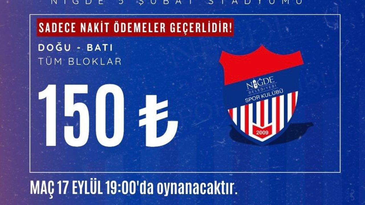 Niğde Belediyespor Kulübü’nden yapılan açıklamaya göre, karşılaşma 17 Eylül Çarşamba günü saat 19.00’da Niğde 5 Şubat Stadyumu’nda oynanacak. Biletlerin satışının 09.00-18.00 saatleri arasında stadyum bilet gişesinden devam ettiği bildirildi. Doğu ve batı tribünleri dahil tüm bloklar için bilet fiyatı 150 TL olarak belirlendi. Kulüp, ödemelerin sadece nakit olarak kabul edildiğini hatırlattı.