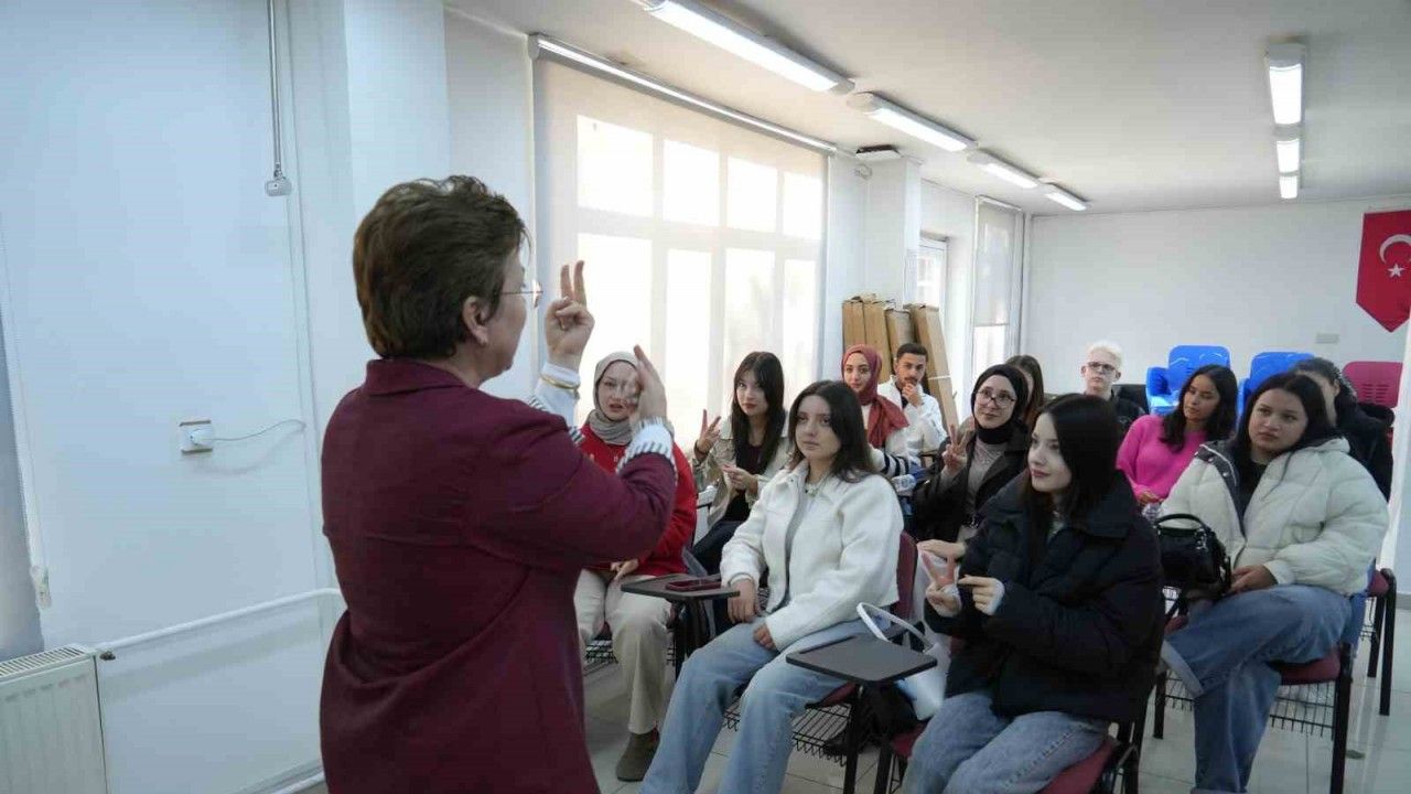 İşaret Dili Öğretmeni Pınar Sunalcan tarafından verilen eğitimlerde öğrenciler, işitme engelli bireylerle sağlıklı iletişim kurabilmek için temel işaret dilini öğreniyor. Pınar Sunalcan, işaret dili eğitimlerinin amacının hem farkındalık oluşturmak hem de işitme engelli bireylere destek olacak bilinçli öğrenciler yetiştirmek olduğunu belirterek, "Üniversitedeki öğrencilerimize işaretleri öğreterek işitme engelli bireylerimize destek sağlamayı amaçlıyoruz. Öğrenecekleri işaretlerle birçok işitme engellinin konuşan ellerimizle dili olacağız, onların hayatına dokunacağız. Bu sosyal sorumluluk projesinde hep birlikte ilerleyerek işitme engellilerimizin her daim yanında olacağız" ifadelerini kullandı.