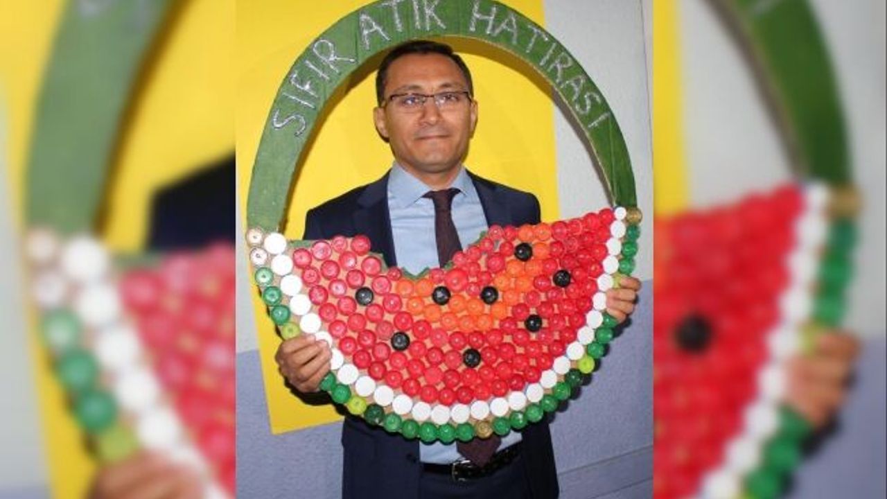 Açılışın ardından sergiyi gezen başta Kaymakam Abdullah Uçgun olmak üzere protokol üyeleri şişe kapaklarından yarım karpuz diliminin yapıldığı 'Sıfır Atık Hatırası' ile fotoğraf çektirdi.