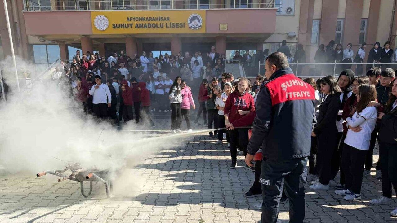 Afyonkarahisar’ın Şuhut ilçesinde itfaiye ekipleri Anadolu Lisesi’nde öğrencilerin bilinçlenmesi amacıyla yangın tatbikatı düzenledi.