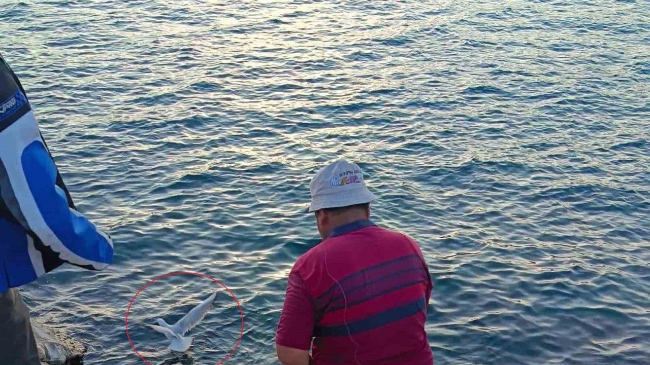 Akşam saatlerinde Kaleiçi Yat Limanı’nda bulunan mendireğe balık tutmaya gelen bir vatandaşın oltasına balık yerine bu kez martı takıldı. Balık tutmak amacıyla oltasını sallayan balıkçının iğnesi o sırada havada uçmakta olan martıya takıldı. Kanadına takılan iğne nedeniyle suya düşen martıyı gören hayretler içerisinde kalan balıkçı oltasına takılan martıyı kıyıya çekti. Kanadına takılan iğneyi çıkartan balıkçının doğaya bıraktığı martı uçarak gözden uzaklaştı.