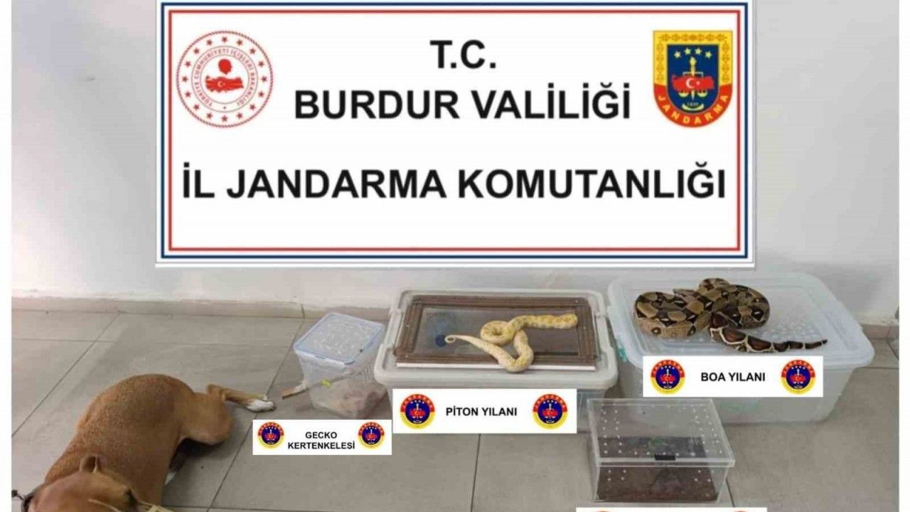Burdur’da jandarma ekipleri tarafından bir eve gerçekleştirilen operasyonlarda burma pitonu, kırmızı kuyruklu boa yılanı, tarantula örümcek, kertenkele ve pitbull köpeği ele geçirildi.