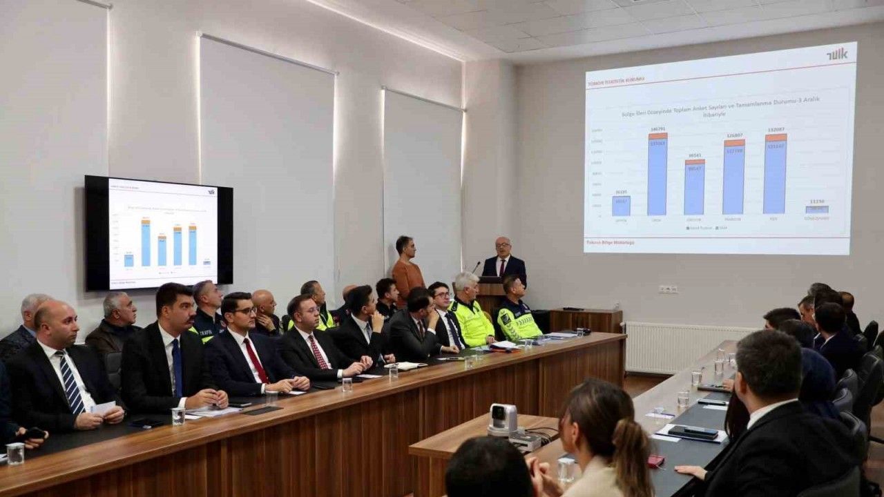 Konut dokunulmazlığının ihlalinin 2024 yılında 58 iken, 2025 yılında 72’ye, cinsel saldırının ise 2024’te 59 iken 2025’te 63 olaya yükseldiğini kaydeden Vali Erol, toplam olay sayılarında yüzde 9 azalma olduğunu, olayları aydınlatma oranının ise 2024 yılı kasım ayında yüzde 99,8 iken, 2025 yılı kasım ayında yüzde 99,9 olduğunu vurguladı. Mal varlığına karşı işlenen 9 önemli suç kategorisinde de düşüşler olduğunu belirten Vali Erol, toplam olaylarda yüzde 14 azalma olduğunu ifade ederek, aydınlatma oranının ise 2024 yılında yüzde 95,8, 2025 yılı 11 aylık süreçte ise yüzde 97 olduğunu aktardı.