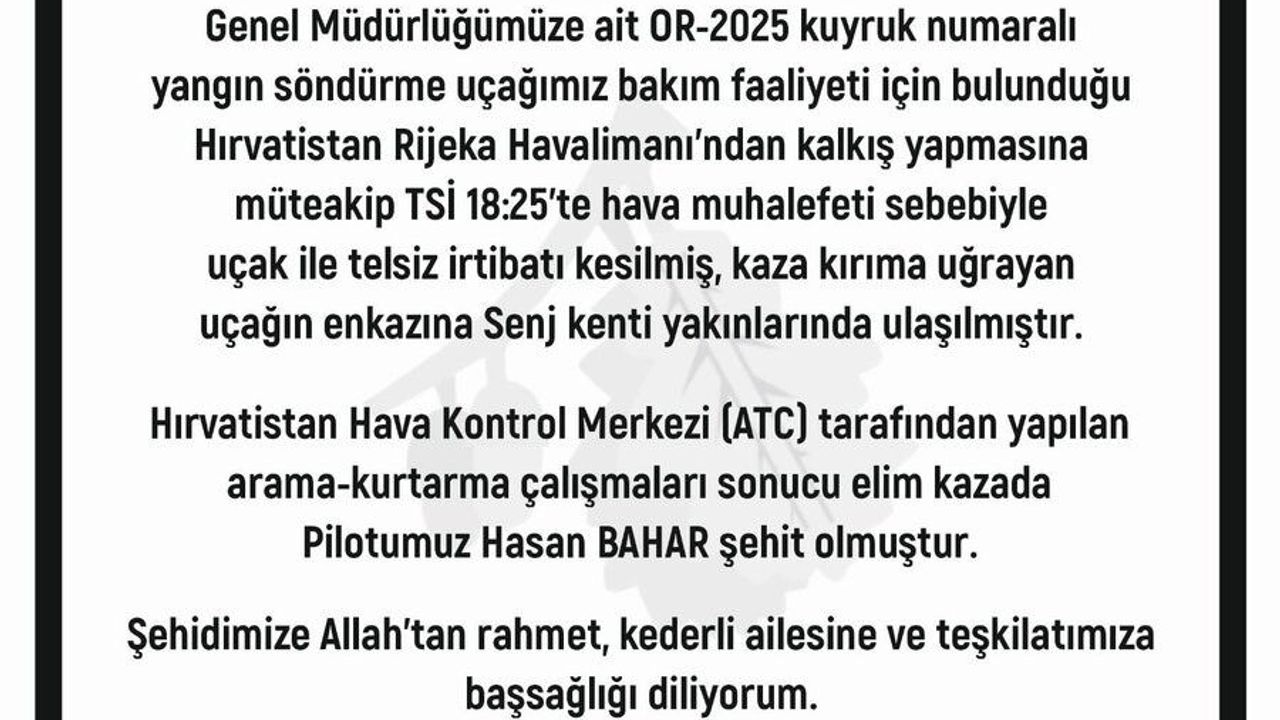 Orman Genel Müdürü Karacabey sosyal medya hesabından yaptığı paylaşımında, "Genel Müdürlüğümüze ait OR-2025 kuyruk numaralı yangın söndürme uçağımız bakım faaliyeti için bulunduğu Hırvatistan Rijeka Havalimanı’ndan kalkış yapmasına müteakip saat 18.25’te hava muhalefeti sebebiyle uçak ile telsiz irtibatı kesilmiş, kaza kırıma uğrayan uçağın enkazına Senj kenti yakınlarında ulaşılmıştır. Hırvatistan Hava Kontrol Merkezi (ATC) tarafından yapılan arama-kurtarma çalışmaları sonucu elim kazada Pilotumuz Hasan Bahar şehit olmuştur. Şehidimize Allah’tan rahmet, kederli ailesine ve teşkilatımıza başsağlığı diliyorum" ifadelerini kullandı.