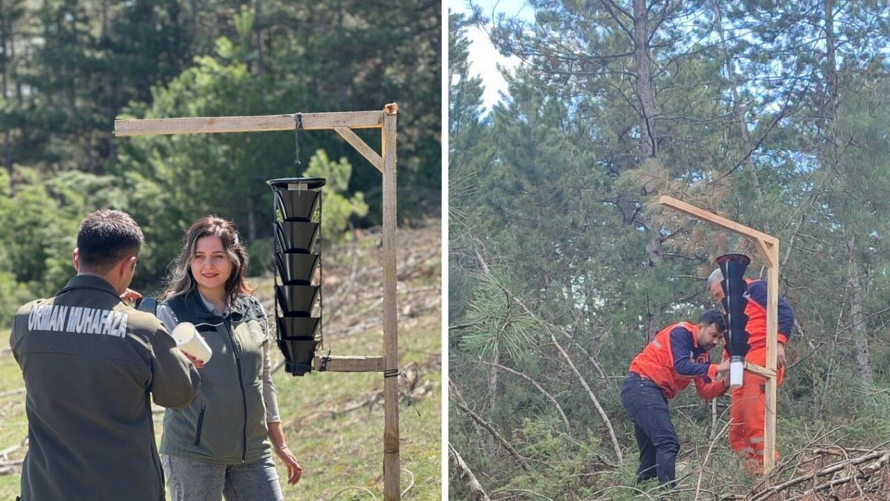 Mudurnu Orman İşletme Müdürlüğü, orman sağlığını tehdit eden, ‘On İki Dişli Çam Kabuk Böceği’ tehlikesine karşı ormanlık alanlara yerleştirilen feromon tuzakları sayesinde böcekleri yakalayarak imha ediyor.