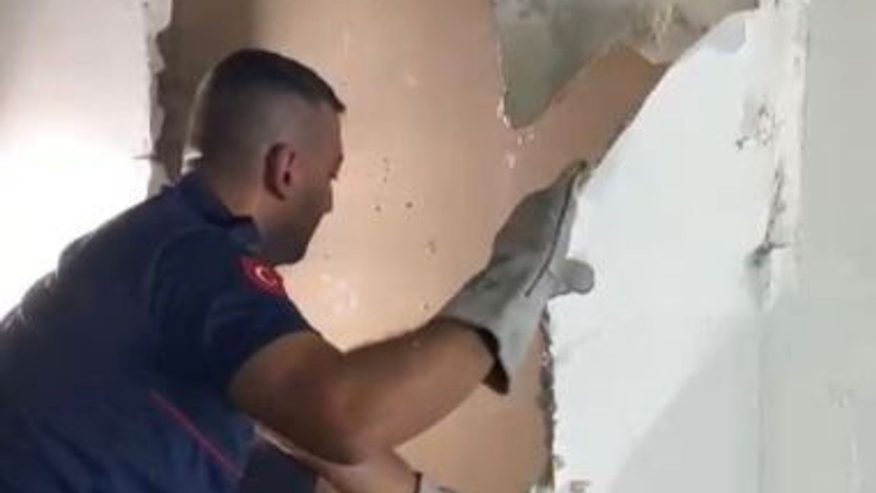 Osmaniye’de alçı panel duvarın içine sıkışan yavru kedi, itfaiye ekiplerince kurtarıldı.
