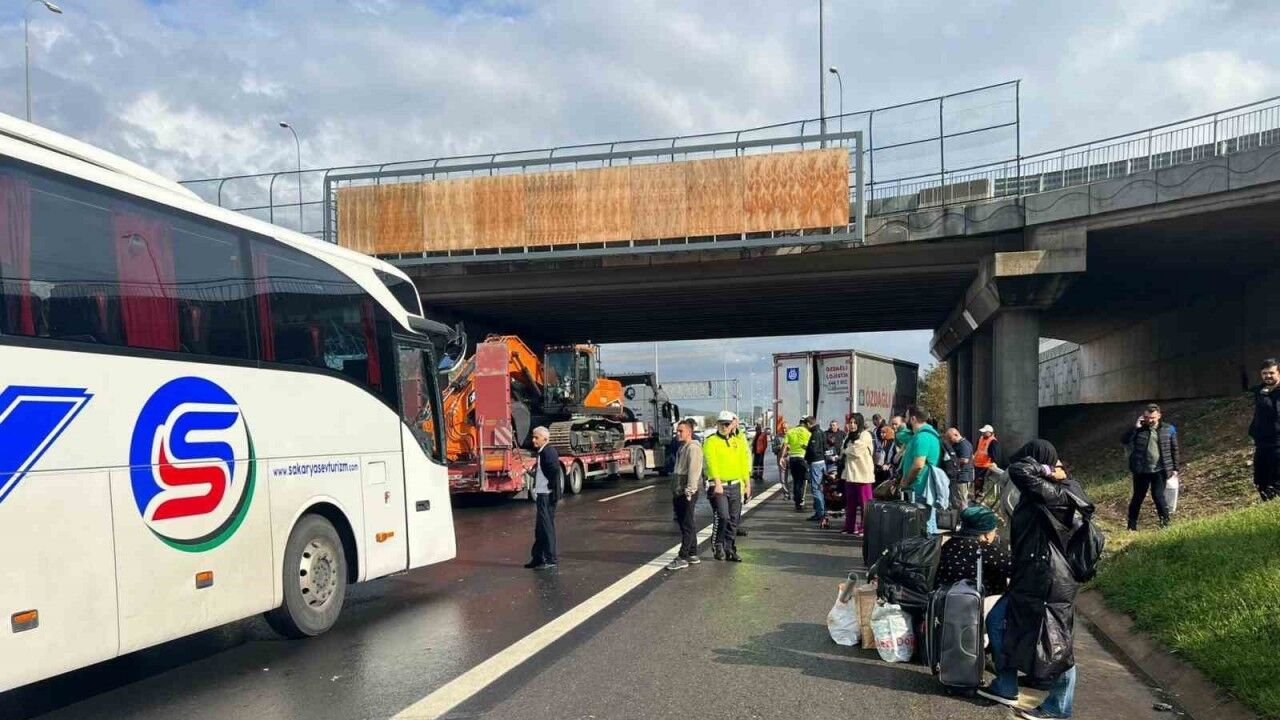 Anadolu TEM Otoyolu’nda zincirleme kaza meydana geldi. Kazada kamyon sürücüsü hafif yaralanırken kazaya karışan otobüsün içerisindeki yolcular ise valizleriyle yolda kaldı.