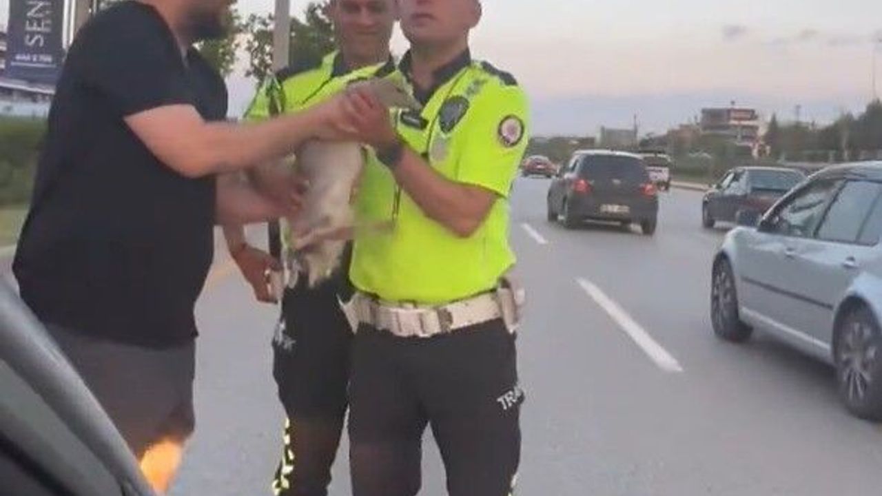 Ankara’da çevre yoluna atlayan ördek, yoldan geçen vatandaşların dikkati ve trafik polislerinin müdahalesi sayesinde ezilmekten kurtarıldı.