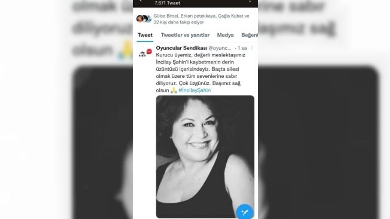 Adını Feriha Koydum, Umutsuz Ev Kadınları, Yasak Elma gibi çok sayıda dizide oynayan ünlü tiyatrocu İncilay Şahin hayatını kaybetti. Acı haberi Oyuncular Sendikası verdi. Oyuncular Sendikasının sosyal medya hesabından yapılan açıklamada, "Kurucu üyemiz, değerli meslektaşımız İncilay Şahin’i kaybetmenin derin üzüntüsü içerisindeyiz. Başta ailesi olmak üzere tüm sevenlerine sabır diliyoruz. Çok üzgünüz. Başımız sağ olsun" ifadelerine yer verildi.