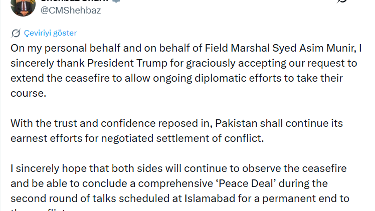 Pakistan Başbakanı Şahbaz Şerif, diplomatik çabaların devamına imkan tanımak için İran'la varılan 2 haftalık ateşkesi uzatma taleplerini kabul eden ABD Başkanı Donald Trump'a teşekkür etti.