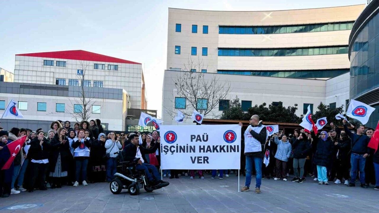 Denizli Pamukkale Üniversitesi (PAÜ) Hastanesinde görevli bir grup sağlık çalışanı eşit çalışma şartları ve eşit ücret talebiyle eylem yaptı.