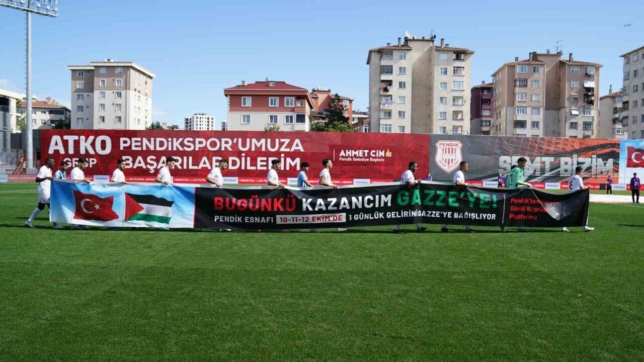 Pendiksporlu futbolcular, dünyanın gözü önünde İsrail’in soykırımına uğrayan Gazze halkına destek için, bugün Adana Demirspor ile oynadıkları karşılaşma öncesinde ’Bugünkü Kazancım Gazze’ye’ yazılı pankart ile sahaya çıktı.