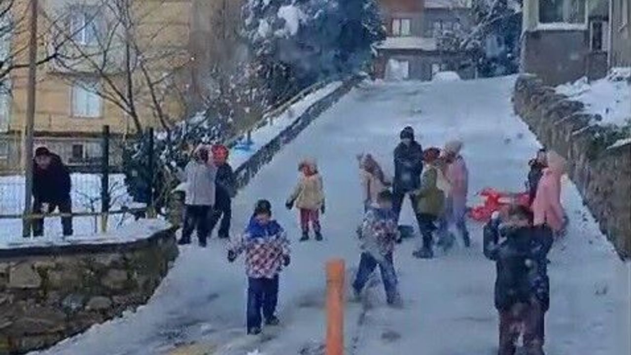 Çocukların kar küreme aracını kar topu ile püskürttüğü anlar, cep telefonu kamerasıyla kaydedildi. Görüntülerde ekiplerin çocukların eğlenmesi için belirli bir alanı karla kaplı bıraktığı görüldü.