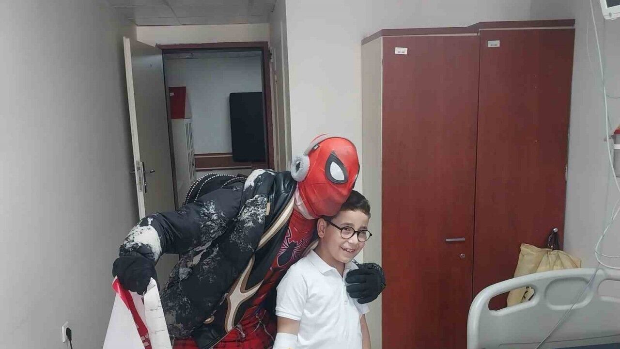 Türkiye’yi gezerek çocuklara moral veren İzmirli "Pijamalı Spiderman" Ayaz Salih Koç, 63. durağı olan Erzurum’da Atatürk Üniversitesi Araştırma Hastanesi’nde yatan minik hastaları ziyaret etti. Çocukların umut ve sevincine ortak olan Koç, hayalini gerçekleştirmeye devam ediyor.