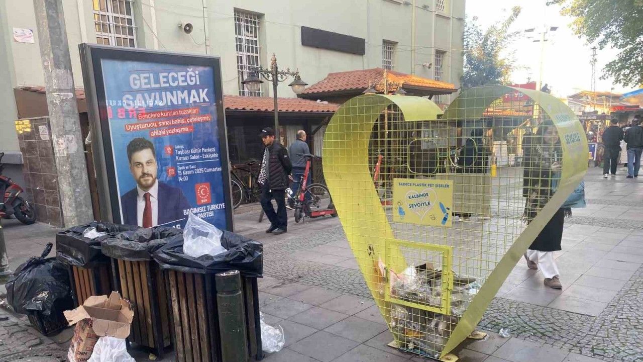 Eskişehir’de bazı duyarsız vatandaşlar, hemen yanında 3 adet çöp kutusu bulunan kalp şeklindeki geri dönüşüm kafesinin içerisine atık maddeler bıraktı.