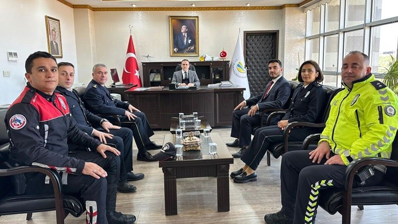 Burhaniye’ de, Emniyet Teşkilatının 180. Kuruluş yılı kutlamaları kapsamında, İlçe Emniyet Müdürü Faik Karabaş ve Emniyet Mensubu komiserlerden oluşan heyet, Kaymakam İlyas Memiş’i makamında ziyaret etti. 7-13 Nisan tarihleri arasında kutlanan Polis Haftası nedeniyle gerçekleşen ziyarette, İlçe Emniyet Müdürü Faik Karabaş, Polis Haftası nedeniyle yapılacak etkinlikler hakkında Kaymakama bilgi verdi. Kaymakam İlyas Memiş, ziyaretten duyduğu memnuniyeti ifade ederek Türk Polis Teşkilatı’nın kuruluşunun 180. Yıldönümünde, Emniyet Teşkilatında görev yapan tüm emniyet mensuplarımızın Polis Haftası’nı kutladı.