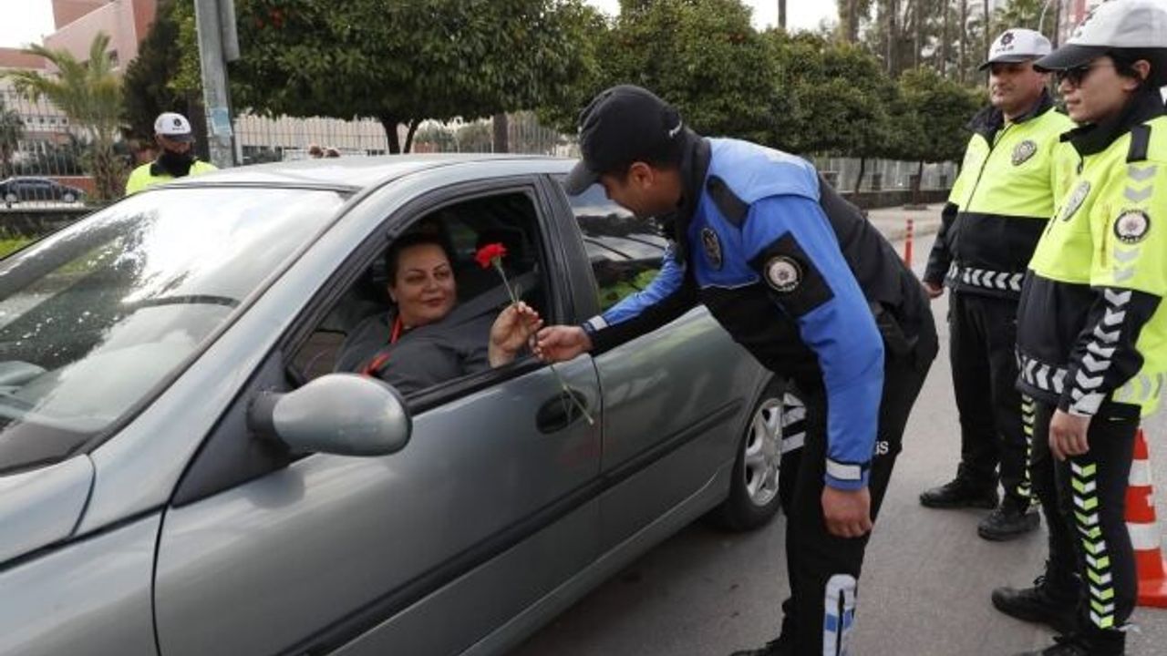Adana’da polis trafikte durdurduğu kadın sürücülere, Kadınlar Günü’nü kutlayıp karanfil dağıttı.