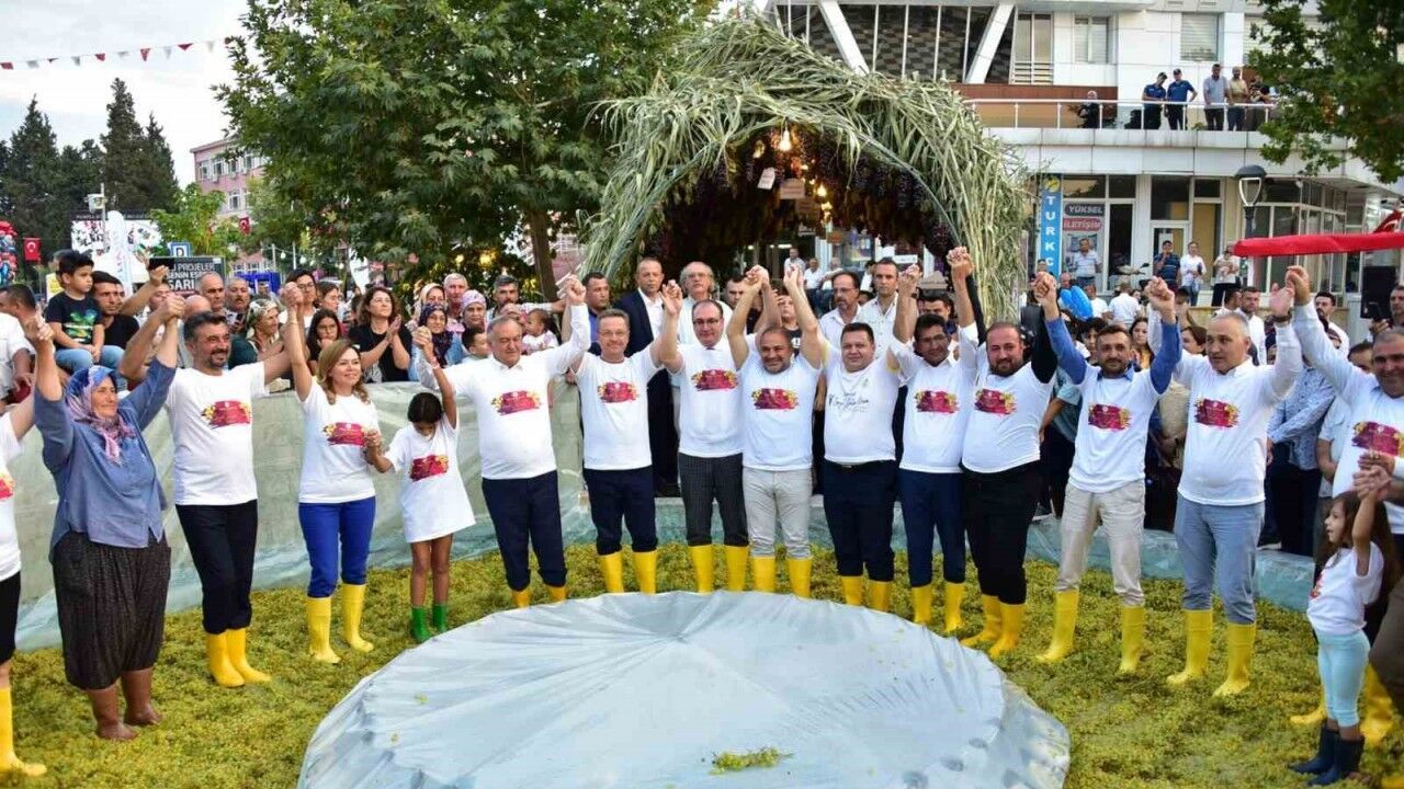 Manisa’nın Sarıgöl ilçesinde düzenlenen 15. Sultaniye Üzüm Festivali etkinlikleri çerçevesinde sarı çizme giyen protokol üyeleri, belediye önündeki havuzda bulunan kilolarca üzümün suyunu geleneksel yöntemle ayaklarıyla ezerek çıkardı.