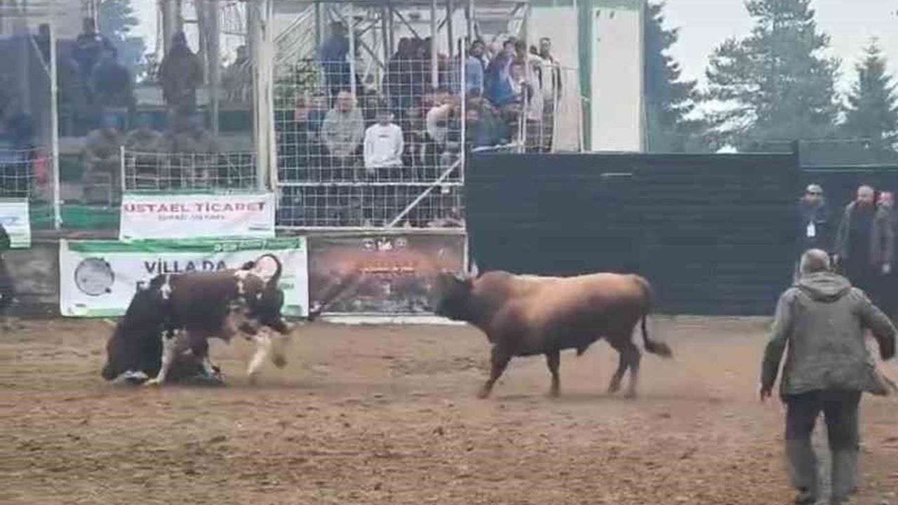 Rakibinden kaçmak isteyen boğa, arenada bulunan bakıcısını boynuz darbesiyle yere serdi.