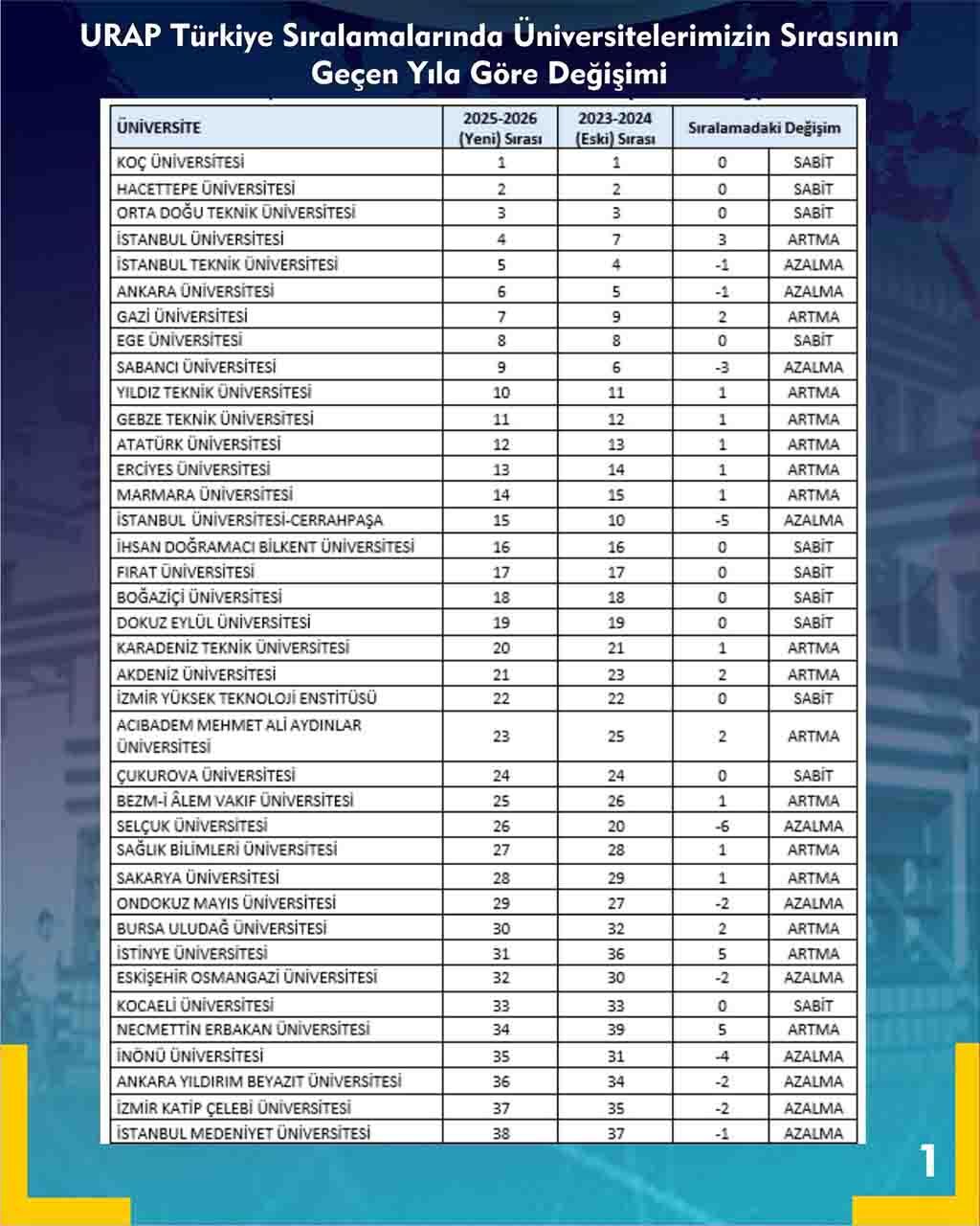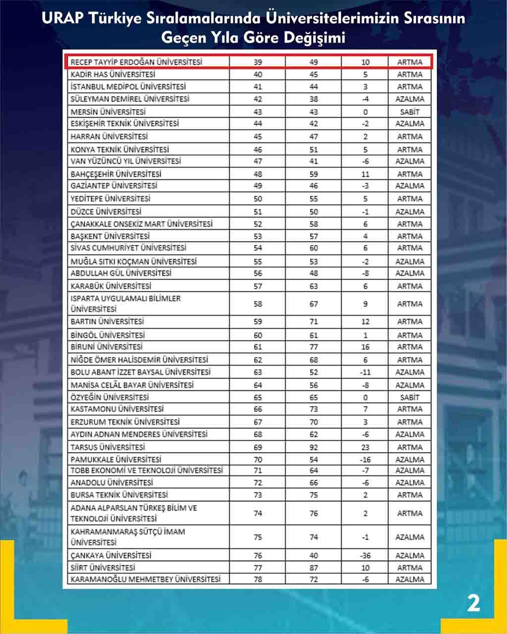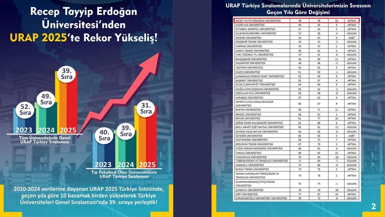 Geçtiğimiz yılki URAP 2024 sıralamasında (2019-2023 dönemini inceleyen) RTEÜ zaten 3 basamaklık bir ivmeyle dikkat çekmişti. Üniversite Rektörü Prof. Dr. Yusuf Yılmaz, URAP 2024’teki yükselişin büyük ölçüde 2023 yılındaki iyi performanstan kaynaklandığını vurguluyor. Ancak rektör Yusuf Yılmaz, önceki dört yılın verilerinin ne yazık ki olumsuz etkilediğini belirterek, "Görev süremizi içeren daha çok yılın analizlere dahil edilmeye başlanmasıyla müthiş değişim gözle görülür hale geliyor" dedi. Heyecanını gizlemeyen Prof. Dr. Yılmaz, geleceğe dair umut dolu sözlerle devam ediyor: "2025 yılı verilerimiz çok daha iyi. URAP 2026'daki yerimizin çok daha iyi olacağını, RTEÜ’nün zirve yolculuğunun başladığını şimdiden ilan ediyorum!"