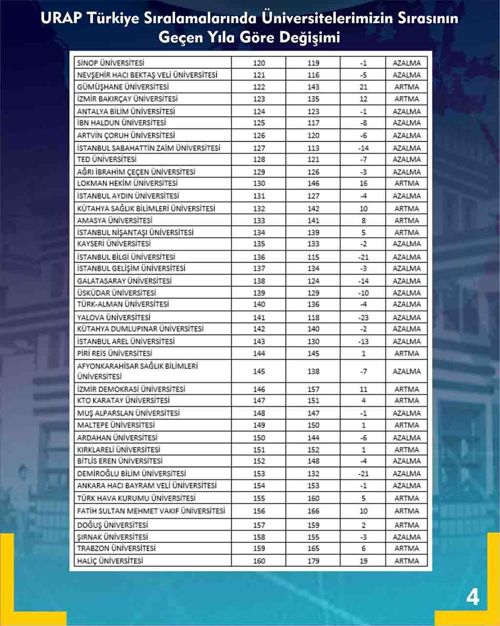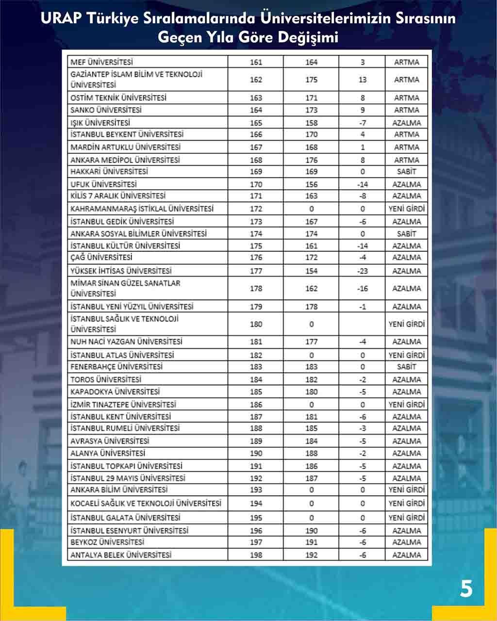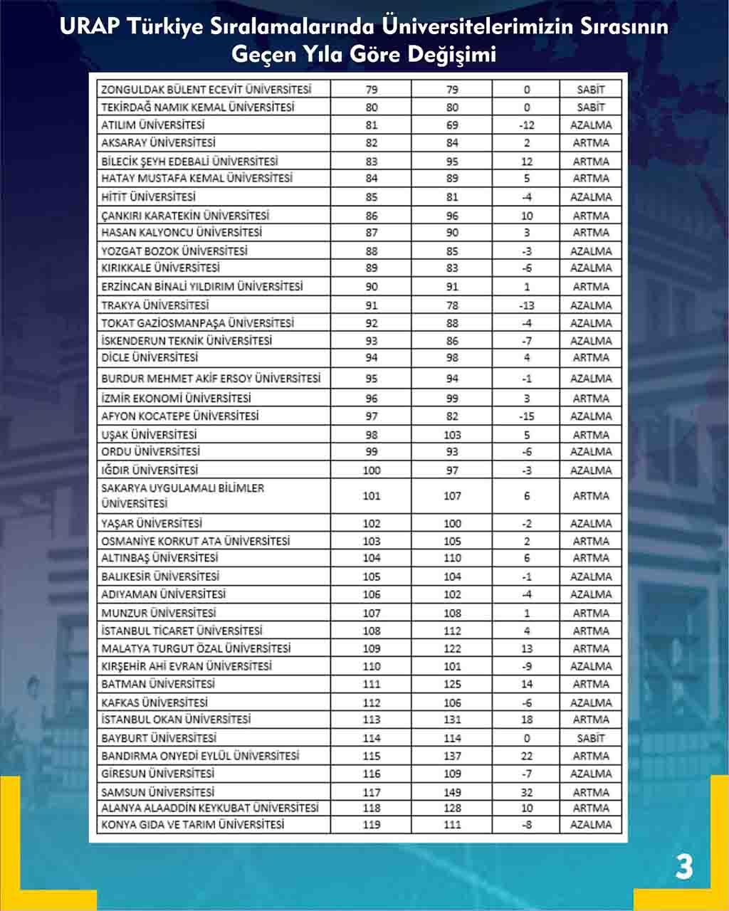 Geçtiğimiz yılki URAP 2024 sıralamasında (2019-2023 dönemini inceleyen) RTEÜ zaten 3 basamaklık bir ivmeyle dikkat çekmişti. Üniversite Rektörü Prof. Dr. Yusuf Yılmaz, URAP 2024’teki yükselişin büyük ölçüde 2023 yılındaki iyi performanstan kaynaklandığını vurguluyor. Ancak rektör Yusuf Yılmaz, önceki dört yılın verilerinin ne yazık ki olumsuz etkilediğini belirterek, "Görev süremizi içeren daha çok yılın analizlere dahil edilmeye başlanmasıyla müthiş değişim gözle görülür hale geliyor" dedi. Heyecanını gizlemeyen Prof. Dr. Yılmaz, geleceğe dair umut dolu sözlerle devam ediyor: "2025 yılı verilerimiz çok daha iyi. URAP 2026'daki yerimizin çok daha iyi olacağını, RTEÜ’nün zirve yolculuğunun başladığını şimdiden ilan ediyorum!"