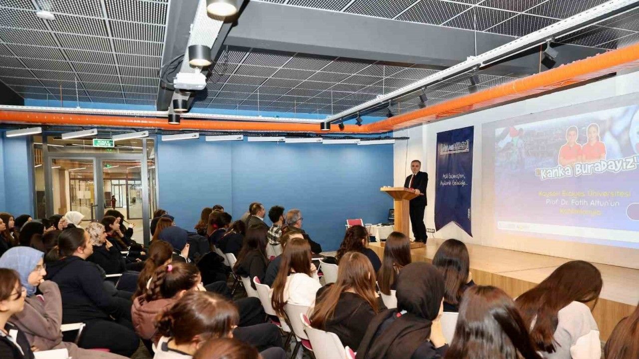 Konferans Salonu’nda ’Kanka Buradayız’ temasıyla düzenlenen söyleşi programında konuşan Rektör Prof. Dr. Fatih Altun, öğrencilere ERÜ hakkında bilgi verdi. Öğrencilere kariyer planlaması hakkında tavsiyelerde bulunan Rektör Prof. Dr. Altun, eğitim hayatının zorluklarına değinerek başarının temelinde istikrar, özgüven ve çalışmanın yer aldığını belirterek; "Kendinize güvenin, emekler karşılıksız kalmaz" dedi. Konuşmasında tarih, kültür, ahlak ve etik değerlerin her mesleğin temelini oluşturduğunu ifade eden Rektör Prof. Dr. Altun, gençlere kitap okumanın önemli olduğunun altını çizerek, "Okumak en güzel dosttur. Araştırmak en güzel alışkanlıktır. Bunları yaptığınız zaman değeriniz artmaktadır. Ancak bu değerin karşılığını beklemeyin, kendiniz için yapın" diye konuştu. Uluslararasılaşmanın önemine dikkat çeken Rektör Prof. Dr. Altun; "Bir insanın ana dili ne kadar güçlü olursa yeni dil öğrenmesi o kadar kolay oluyor. Lütfen en az üç yabancı dil öğrenin" diye konuştu.