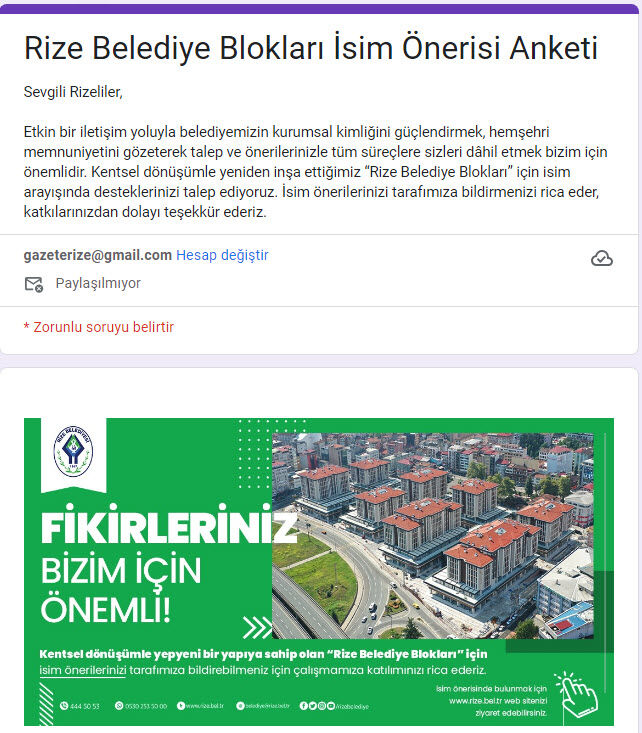 Belediye Başkanı Metin, hem şehrin tam merkezinde olduğu için hem de Rize ticaretinin kalbi konumundaki alanda inşaatın, Rize halkının sabrıyla tamamlanmasından dolayı alana verilecek ismi de Rize ile belirlemek istiyor. Bunun için Rize Belediyesi sosyal medya hesaplarından “Etkin bir iletişim yoluyla belediyemizin kurumsal kimliğini güçlendirmek, hemşehri memnuniyetini gözeterek talep ve önerilerinizle tüm süreçlere sizleri dâhil etmek bizim için önemlidir. Kentsel dönüşümle yeniden inşa ettiğimiz “Rize Belediye Blokları” için isim arayışında desteklerinizi talep ediyoruz. İsim önerilerinizi tarafımıza bildirmenizi rica eder, katkılarınızdan dolayı teşekkür ederiz.” Paylaşımı yapılarak destek istendi. Fikirleriniz bizim için önemli başlığı ile https://docs.google.com/forms/d/e/1FAIpQLScpZQOGyn4Slk4lKvdshk7rznv_e3tPMVYhp2siRjYvW3Mfrw/viewform?pli=1 linkine önerilerin bildirilmesi istendi. Gelen önerilere göre yeni belediye bloklarının ismi açıklanacak.