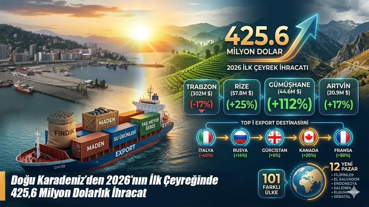 Doğu Karadeniz İhracatçılar Birliği (DKİB) verilerine göre, 2026 yılı Ocak-Mart döneminde Trabzon, Rize, Artvin ve Gümüşhane’den toplam 425 milyon 665 bin 878 dolar ihracat gerçekleştirildi.