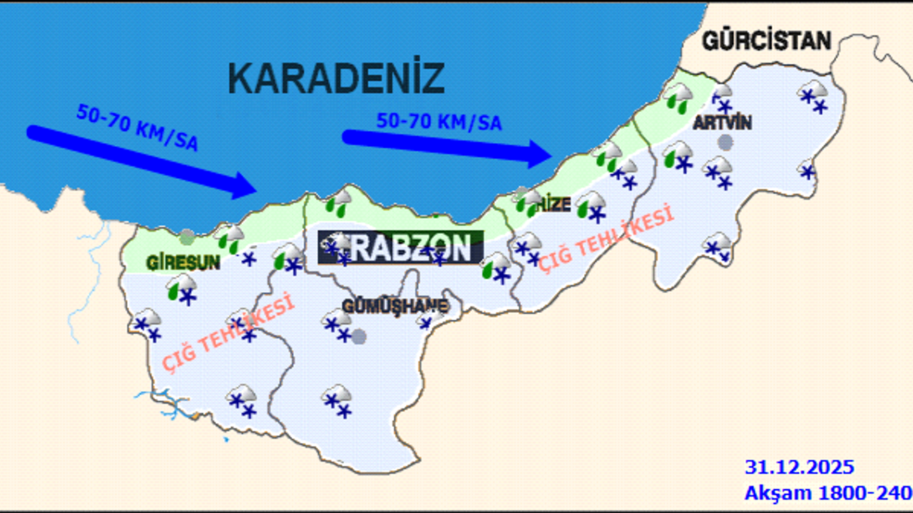 Ayrıca, Doğu Karadeniz denizlerinde Çarşamba sabah saatlerinden itibaren batısında, akşam saatlerinden sonra ise Trabzon-Rize hattında batı ve kuzeybatıdan 6 ila 8 kuvvetinde (50-75 km/saat) fırtına beklendiği ifade edildi. Fırtınanın Perşembe günü (01.01.2026) ilk saatlerde etkisini kaybetmesi beklenirken, denizciler ve balıkçıların dikkatli olması gerektiği bildirildi.