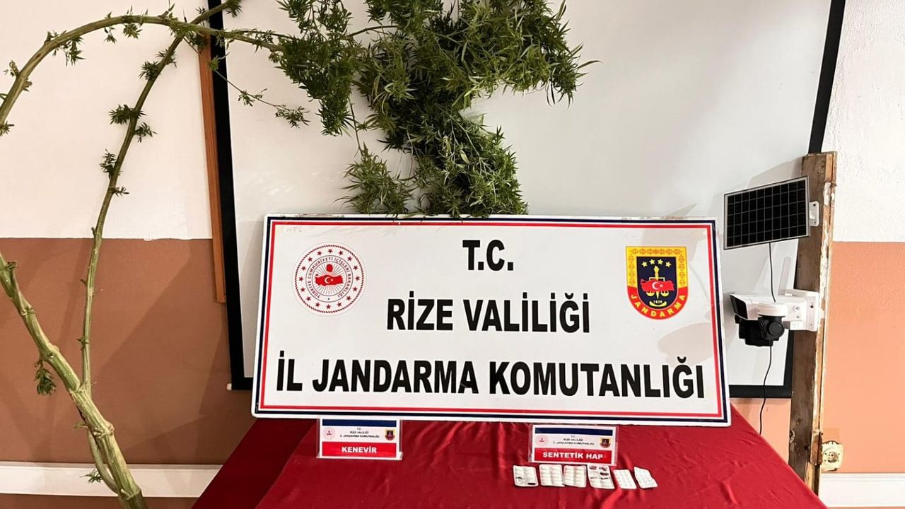 Rize İl Jandarma Komutanlığınca Pazar ilçesi Dernek köyünde şüpheli V.Y.(E/35) isimli şahsın ikametinde ve eklentilerinde yapılan aramada; 1 Kök Kenevir bitkisi, 44 adet psikotrop ilaç ele geçirildi.