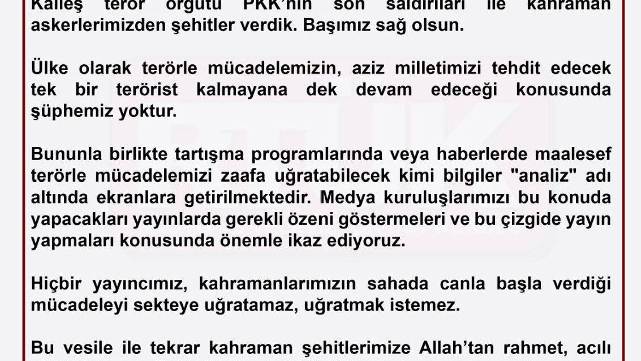 “Kalleş terör örgütü PKK’nın son saldırıları ile kahraman askerlerimizden şehitler verdik. Başımız sağ olsun. Ülke olarak terörle mücadelemizin, aziz milletimizi tehdit edecek tek bir terörist kalmayana dek devam edeceği konusunda şüphemiz yoktur. Bununla birlikte tartışma programlarında veya haberlerde maalesef terörle mücadelemizi zaafa uğratabilecek kimi bilgiler ’analiz’ adı altında ekranlara getirilmektedir. Medya kuruluşlarımızı bu konuda yapacakları yayınlarda gerekli özeni göstermeleri ve bu çizgide yayın yapmaları konusunda önemle ikaz ediyoruz. Hiçbir yayıncımız, kahramanlarımızın sahada canla başla verdiği mücadeleyi sekteye uğratamaz, uğratmak istemez. Bu vesile ile tekrar kahraman şehitlerimize Allah’tan rahmet, acılı ailelerine ve milletimize başsağlığı diliyoruz.”