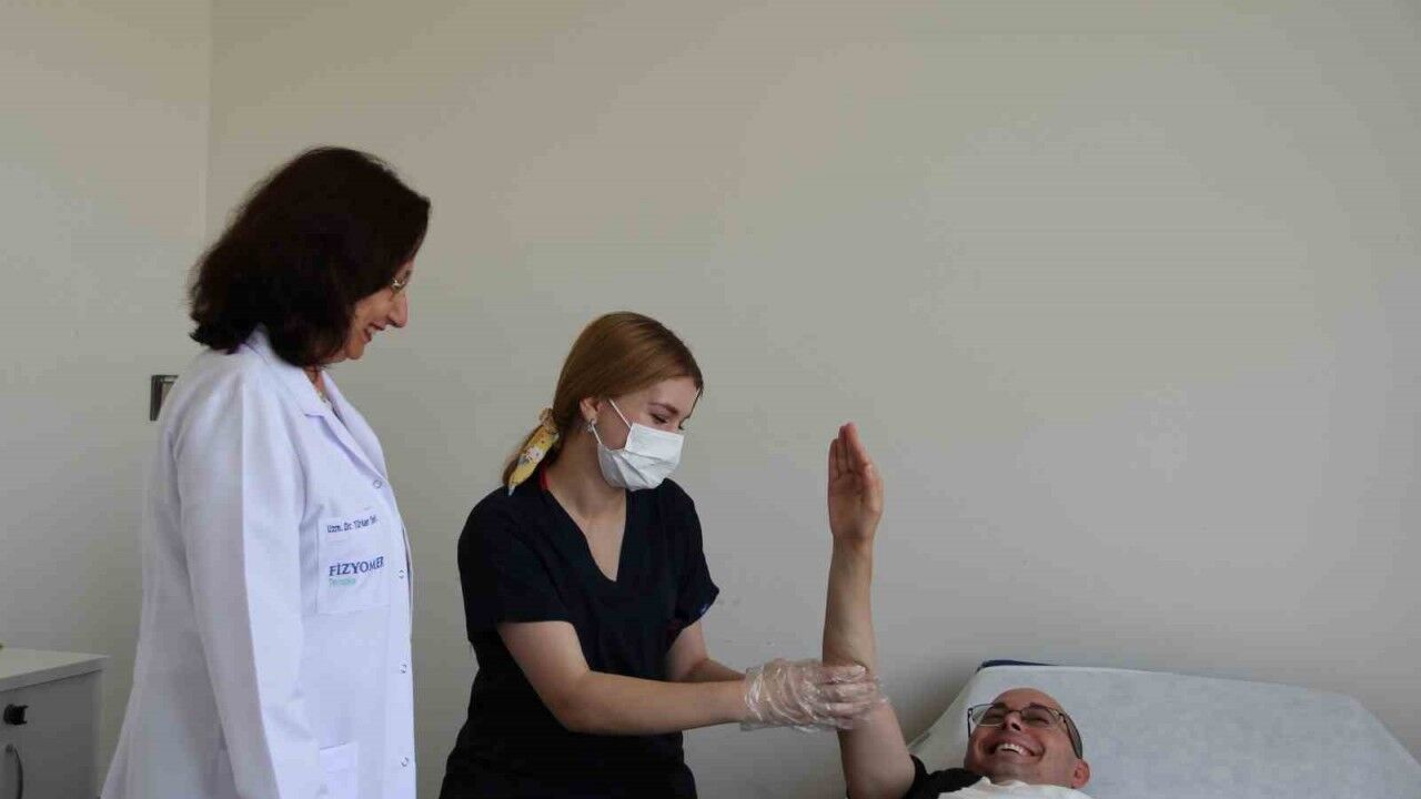 Ziya Murat Kara’nın durumu hakkında konuşan Eskişehir Fizyomer Terapia Fizik Tedavi ve Rehabilitasyon Tıp Merkezi Tıbbi Direktörü Uzm. Dr. Türkan Tünerir, “Öncelikle sağ humerus kırığına bağlı olarak sağ omuz hareketlerinde ve sağ dirsek hareketlerinde aşırı kısıtlılık vardı ve sağ el bileğini de kaldıramıyordu. Biz aynı zamanda fizik tedavi programında hem kırık sonrası oluşan omuz ve dirsek kontraktürünü hem de sinir hasarının tedavisini yaptık. Öncelikle eklem kısıtlılıklarını giderdik. Sağ omuzu tam hareket edebilir hale getirdik. Hareketleri pasif olarak biz yaptığımızda yapabiliyordu, dirseği de öyleydi ama kendisi yapmaya kalktığında aktif hareketleri yoktu. Yani omuzunu yarıya kadar bile kendisi kaldıramıyordu, dirseğini çekemiyordu. El bileğini hiç yukarıya kaldıramıyordu. Tabi bu hastanın günlük yaşam fonksiyonlarını da çok aşırı etkiliyor, ayrıca iş yaşantısını da olumsuz etkiliyordu. Brakial pleksus lezyonları kazalardan sonra, omuz kırıklarından sonra özellikle sık karşılaşılan bir durum mutlaka kırık sonrası rehabilitasyonlarda göz önüne alınmalı. Sinirde bir hasar oluşup oluşmadığı kontrol edilmeli. Hastamıza 8 aylık bir tedavi süreci planladık. Bu ay dördüncü ayımıza girdik. Artık sağ omuz hareketlerini kendisi tamamen aktif olarak yapabiliyor. Dirsek hareketlerini yapabiliyor. Artık el bileğini kaldırabiliyor. Bu durum hastamız için çok büyük moral oldu” dedi.