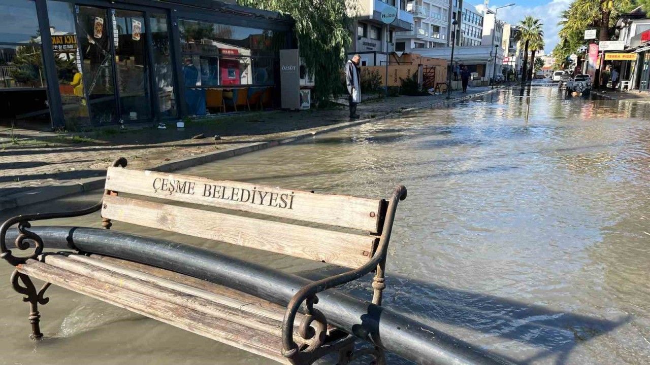 Şiddetli yağışın etkili olduğu Çeşme’de deniz seviyesinin yükselmesi ve tahliye hatlarının tıkanması nedeniyle ilçe merkezinde su baskınları yaşandı. İlçede hayat olumsuz etkilendi.
