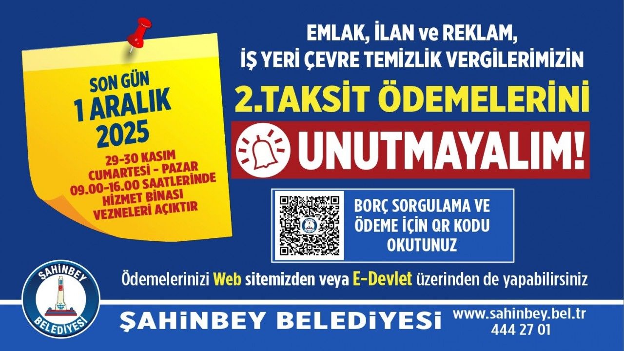 Şahinbey Belediyesi, 2025 yılı Emlak Vergisi, İş Yeri Çevre Temizlik Vergisi ile İlan ve Reklam Vergisi borçlarının ikinci taksit ödemeleri için son tarihin 1 Aralık 2025 Pazartesi olduğunu hatırlattı. Şahinbey Belediye Başkanı Mehmet Tahmazoğlu, vatandaşlara çağrıda bulunarak gecikme cezalarıyla karşılaşılmaması için ödemelerin zamanında yapılması gerektiğini vurguladı.