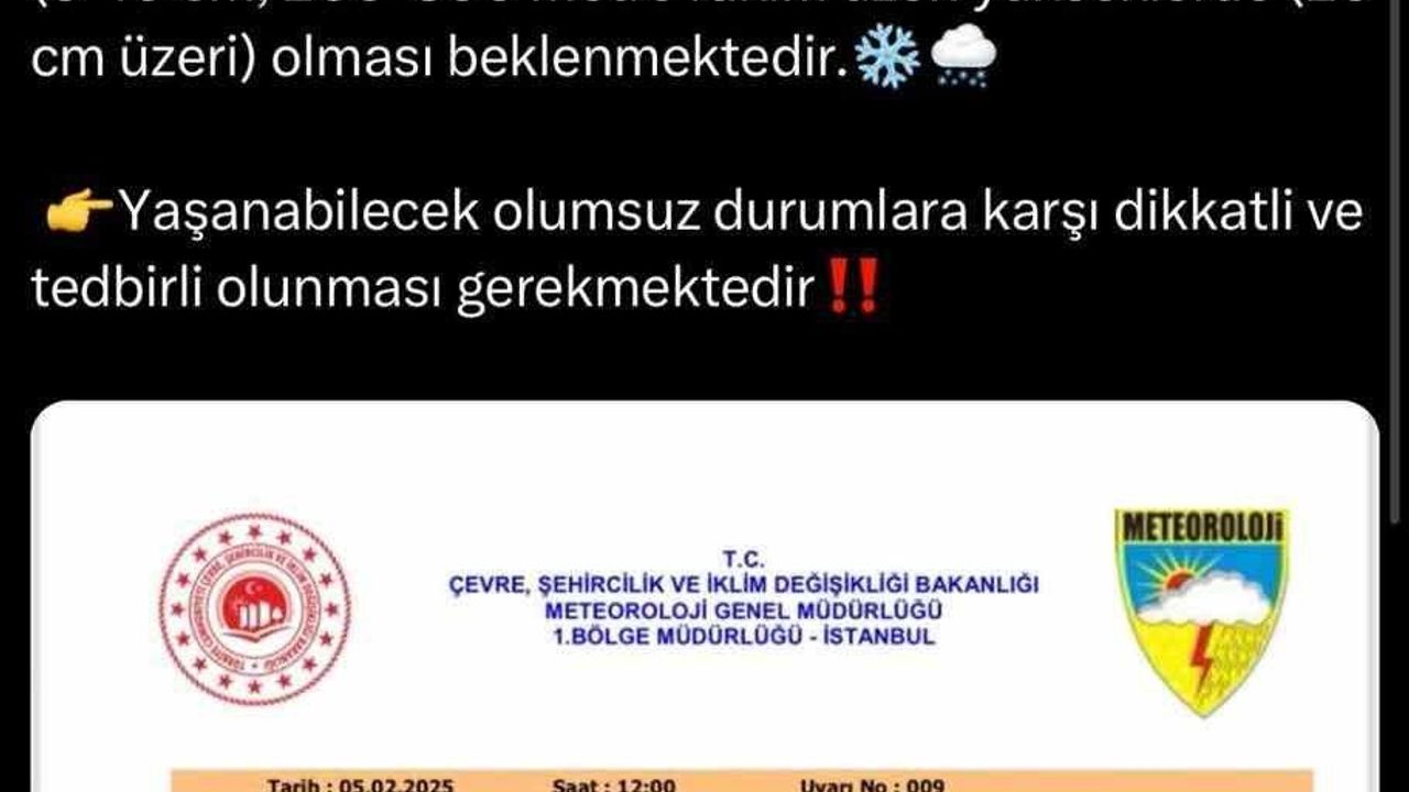 Sakarya Valiliği, meteorolojik verilere göre bu akşam saatlerinden itibaren etkisini artırması beklenen kar yağışı sebebiyle uyarılarda bulundu. Valiliğin sosyal medya hesabından yapılan paylaşımda, "Meteoroloji verilerine göre; Bugün akşam saatlerinden itibaren ilimizde etkisini arttırması beklenen kar yağışlarının; aralıklı ve yerel olmak üzere kuvvetli, yüksek kesimlerde yer yer yoğun 5-10 santimetre, 200-300 metre rakım üzeri yükseklerde 20 santimetre üzeri olması beklenmektedir. Yaşanabilecek olumsuz durumlara karşı dikkatli ve tedbirli olunması gerekmektedir" ifadelerine yer verildi.