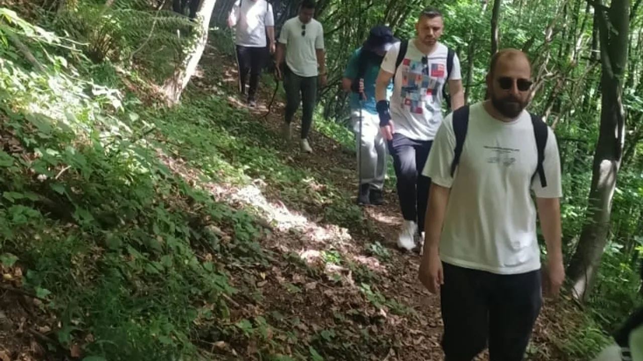 12 kilometrelik parkura egzersiz hareketleriyle başlayan doğa tutkunları yürüyüş boyunca fotoğraf çekilerek anı biriktirdi.