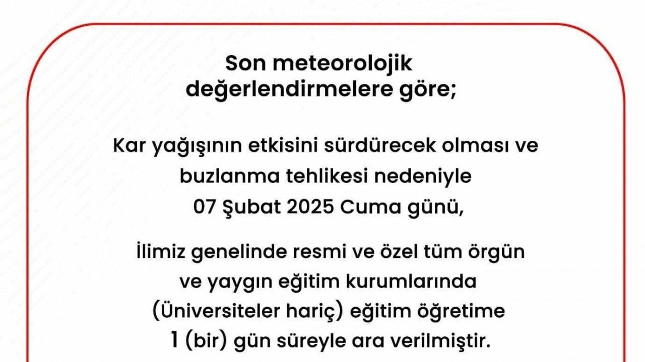 Sakarya’da sabah saatlerinde başlayan ve etkisini artırarak sürdürmesi beklenen kar yağışı sebebi ile okullar 1 gün daha tatil edildi. Konuya ilişkin Sakarya Valiliği’nden yapılan yazılı açıklamada, "Son meteorolojik değerlendirmelere göre; kar yağışının etkisini artırarak sürdürecek olması ve buzlanma tehlikesi nedeniyle 7 Şubat 2025 Cuma günü, ilimiz genelinde resmi ve özel tüm örgün ve yaygın eğitim kurumlarında (üniversiteler hariç) eğitim öğretime 1 (bir) gün süreyle ara verilmiştir. Kamu kurumlarında çalışan hamile, engelli ve kronik hastalığı olan personel ile anaokulu ve kreşlere devam eden çocuğu bulunan kadın personellerimiz 1 gün idari izinli sayılacaktır" denildi.