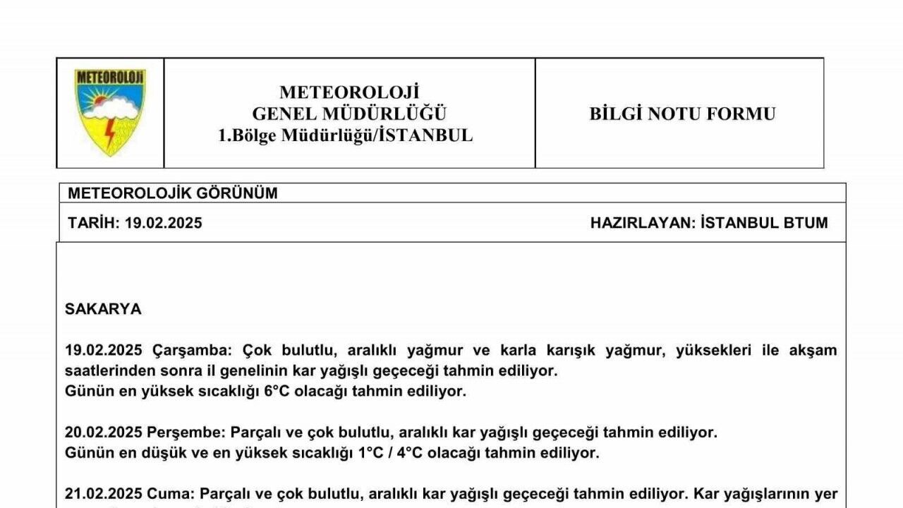Meteoroloji Genel Müdürlüğü, Sakarya’da gün boyunca soğuk ve yağışlı havanın yaşanacağını, hava sıcaklıklarının mevsim normallerinin 5-8 derece altında olacağını açıkladı. Bunun üzerine Sakarya Valiliği, vatandaşları yaşanabilecek olumsuz durumlara karşı dikkatli olunması konusunda uyardı. Sakarya Valiliği tarafından yapılan açıklamada, "İlimizin bugünden (19 Şubat Çarşamba) itibaren soğuk ve yağışlı havanın etkisi altına girmesi ve hava sıcaklıklarının mevsim normallerinin 5-8 derece altında seyretmesi beklenmekte olup; Rüzgarın kuzey yönlerden orta kuvvette, bugün (Çarşamba) ve yarın (Perşembe) zaman zaman kuvvetli (30-50 km/saat) eseceği tahmin edilmektedir. Soğuk ve yağışlı havanın hafta sonuna kadar etkili olması beklenirken, kar yağışlarının yer yer yoğun ve kuvvetli olması beklenmektedir. Yaşanabilecek olumsuz durumlara karşı dikkatli ve tedbirli olunması gerekmektedir" denildi.