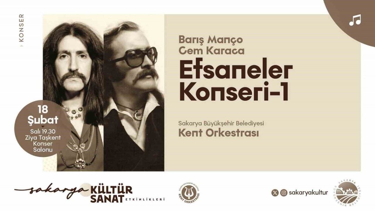 Sakarya Büyükşehir Belediyesi Şubat ayı Kültür Takvimi çerçevesinde Sakaryalı sanat dostları unutulmaz bir akşam geçirecek. Ziya Taşkent Konser Salonu’nda Barış Manço ve Cem Karaca şarkılarıyla "Efsaneler Konseri" gerçekleştirilecek.